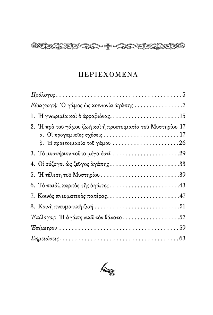 Είναι κοινή διαπίστωση πώς στις μέρες μας ο θεσμός του γάμου και της οικογενείας διέρχεται μια βαθιά και πρωτόγνωρη κρίση. Το βιβλίο, καρπός πολυετούς πείρας στο εξομολογητήριο, παρουσιάζει το πρόβλημα, τις αιτίες του και την ορθόδοξη θεραπεία του. Με βάση την αγιοφραφική και πατερική διδασκαλία αναλύεται το Μυστήριο αυτό της αγάπης και τοποθετούνται οι σωστές βάσεις για την κοινή πνευματική πορεία του ζεύγους. Απλό και συνοπτικό βιβλίο, έχει διαδοθεί και αγαπηθεί ιδιαίτερα.