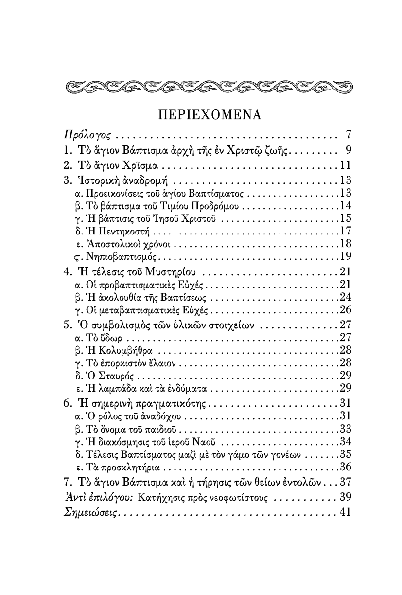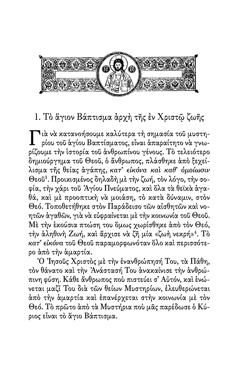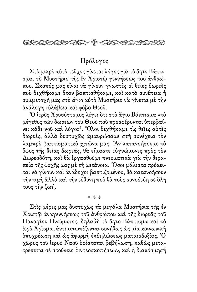 Το άγιο Βάπτισμα είναι η πνευματική μας γέννηση, από την οποία ανατέλλει μέσα μας η ζωή του Χριστού. Πώς αντιμετωπίζουμε όμως εμείς την ανέκφραστη αυτή δωρεά του Χριστού; Το βιβλίο αυτό, με σύντομο και περιεκτικό τρόπο αναλύει τα Μυστήρια του Βαπτίσματος και του Χρίσματος, κάνει μία ιστορική αναδρομή, και τέλος παρουσιάζει την σημερινή πραγματικότητα που αντικρύζουμε στους ιερούς Ναούς μας. Βοήθημα απαραίτητο για Ιερείς, για κατηχητές, για αναδόχους, και για όποιον ενδιαφέρεται να μάθη σχετικά με το Μυστήριο του αγίου Βαπτίσματος.