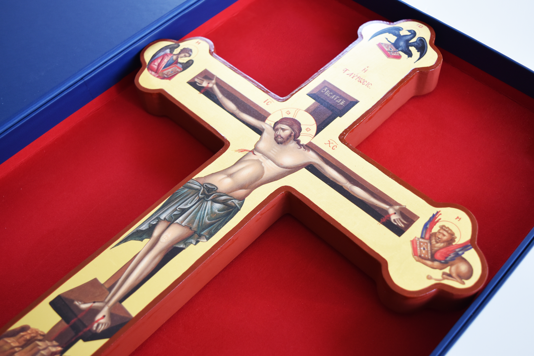 This Holy Cross background is composed of 22 Karat Gold leaves that are applied by hand, piece by piece.
